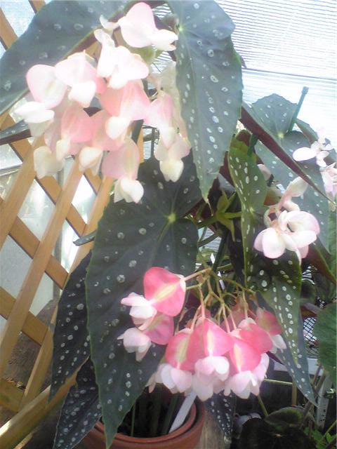 はな、木立てベゴニア:木立てベゴニアのいいとこは、花が終わっても観葉植物の価値もあるということです。ショックに弱く、ボロボロッと落ちてしまいます。今が一番の季節です。