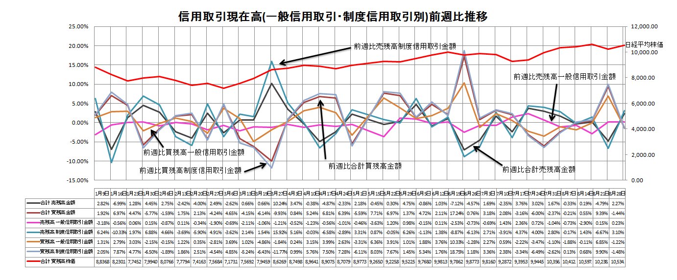 この週(24~28日)の日経平均株価は約295円上昇し、週半ばに年初来高値(1万639円)を更新した。高値を付けたことでいったん利益を確定するための売りが出たようだ。一方、信用売り残高は2週ぶりに増加。前の週に比べ210億円増の9482億円となった。(日経新聞)