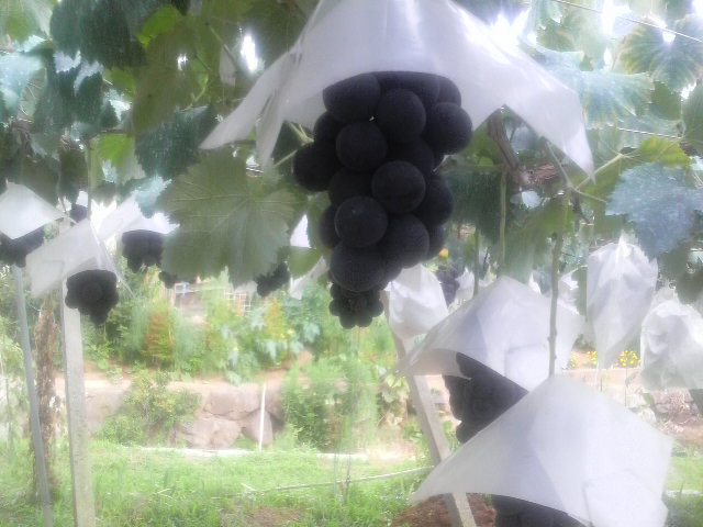 TAROSSA殿プロフ写真のように綺麗にぶどうを撮りたかったものの、光が反射して難しゅうござりました。このぶどう園でも食べごろがあるのか、大部分が袋に覆われておりました。同じ畑でも、陽光の当たる場所によって時期が異なるようでござる。