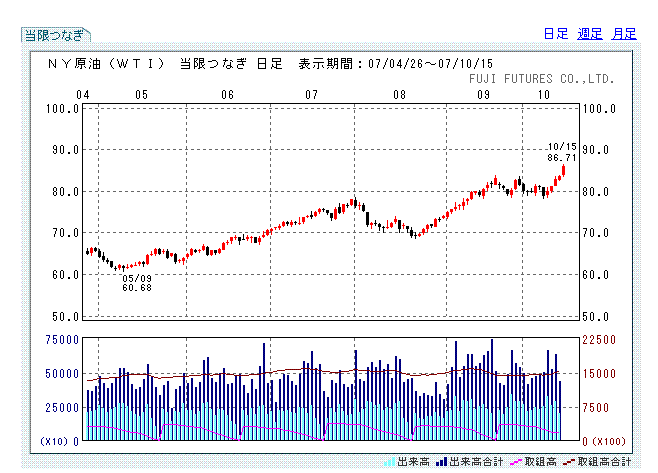 ・NY市場は大幅反落。シティグループが3Q決算を発表し、10/1に発表した業績見通しに比べ、損失計上が大きかったことと今後の収益見通しについて楽観視できないとの見方を示したことにより、金融セクターが売られました。また、原油価格が最高値を更新したことも嫌気されたようです。今週は決算が続々と出てくるので決算待ちで買いが入りにくく、それが下落幅を大きくした面もあるようです。