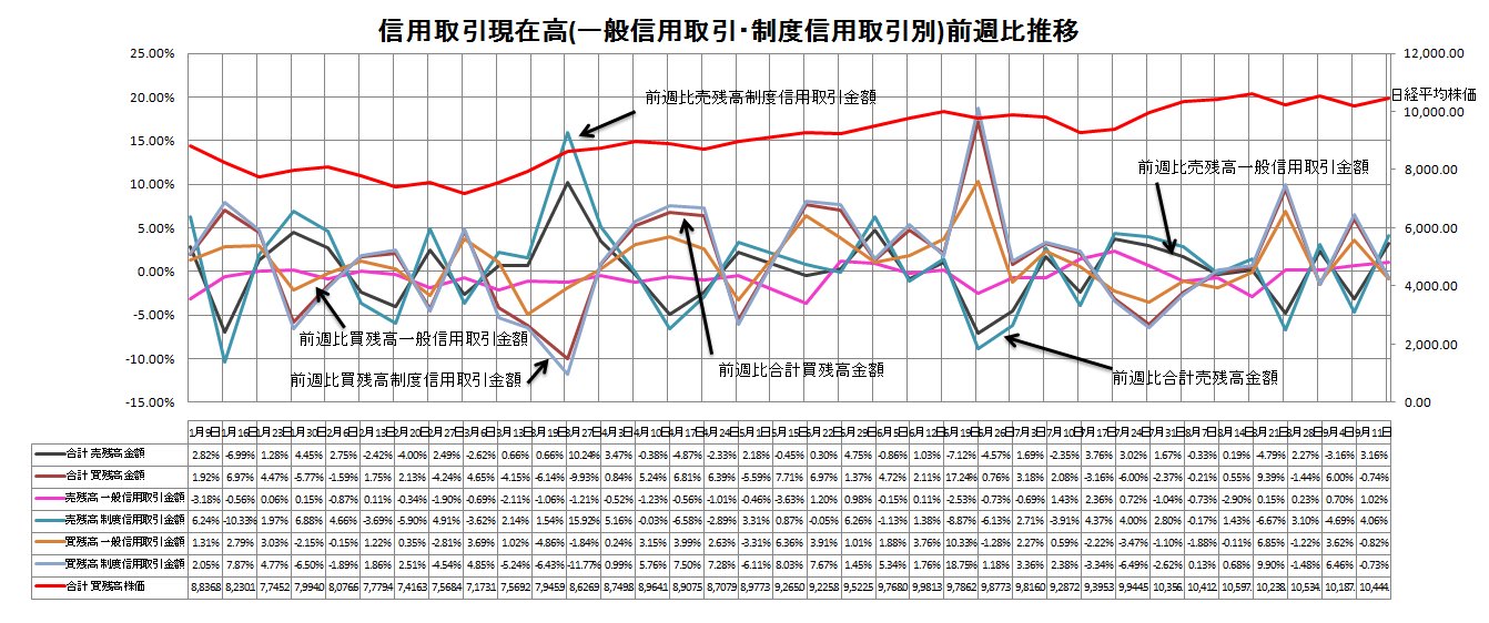 一方、信用売り残は増加に転じた。週末にかけて円相場が一時1ドル=90円台前半と円高が進んだため、輸出関連企業の収益悪化懸念で株価が調整するとの見方から売りが出た。売り残高は前の週に比べ290億円増の9473億円。個別では、7日に当日終値を下回る公募価格を決定したNTN(6472)や、10日に株価により条件が変わる転換社債(MSCB)を150億円発行すると発表した長谷工(1808)の売り残増加が目立った。(日経新聞)