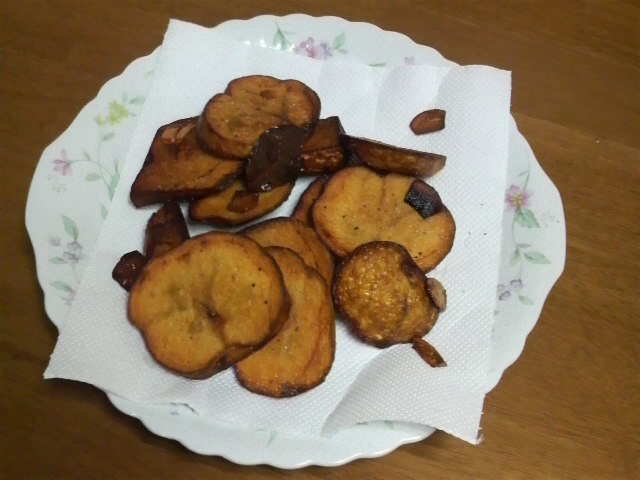 写真左は「じゃがいもガーリック油揚げ」。フライパンにオリーブ油を薄く張り、薄くスライスしたにんにく、ローリエ、じゃがいも(皮を剥いて厚めに切って水にさらし、水気をきっておく)を揚げていきまする。塩と黒コショウで味をつけて出来上がり。