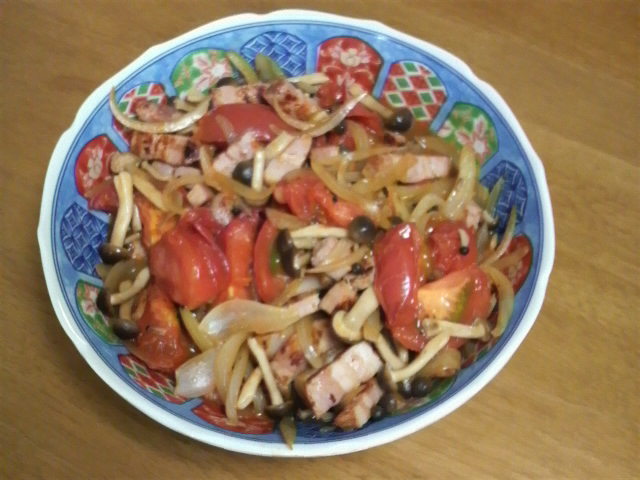 今回は一応新作ながら、あまりにも簡単料理過ぎて申し訳なにので、もう1品、お馴染み「ベーコントマト炒め」(写真中央)も、合わせ技で載せておきまする。