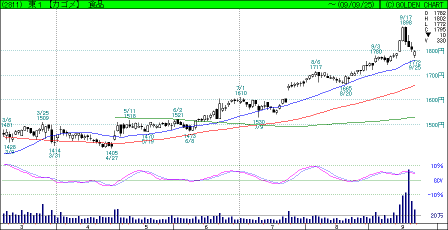 昨日金曜は、9月中間期決算銘柄の権利落ち日ということで、配当分も含めた上で大幅下落だったものの、なぜかあまり下がらなかったのが、拙者お得意の2811 カゴメ(画像右チャート)。