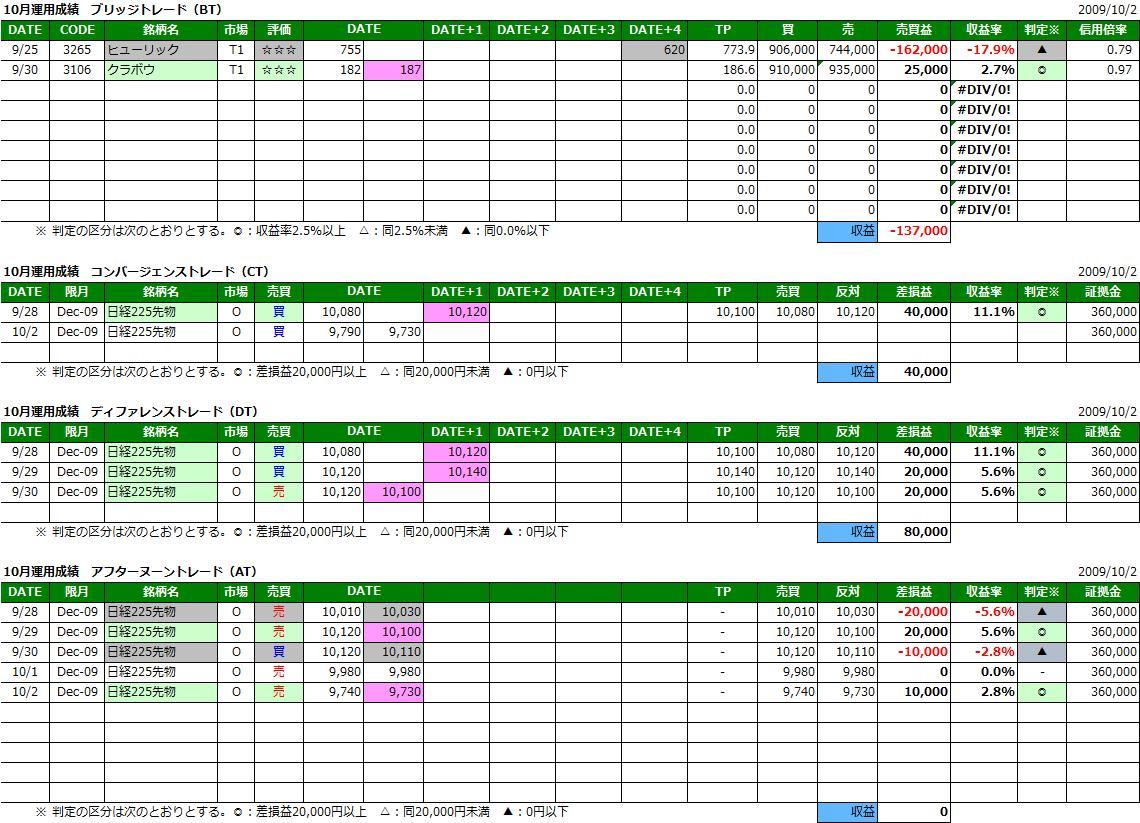 25日のアフターヌーントレード(AT)において10,260円の売り建玉を持ち越しており、28日の寄付きで買戻した18万円、28日(10,010円)の売り建玉を10月1日(9,990円)で買戻した2万円、10月1日(9,980円)で売り建玉をイブニング・セッション(9,960円)で買戻した2万円。