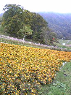 山麓のレストランで昼食をとり、周辺を少し散策しました。コスモスをはじめとして色とりどりの花が咲いていてとてもきれいでした。周囲の山々もほんの少し色づき始めたくらいで紅葉もこれからといった感じでした。でも、吹きわたる風は冷たく秋は短く、あっと言う間に冬が訪れそうな雰囲気でした。