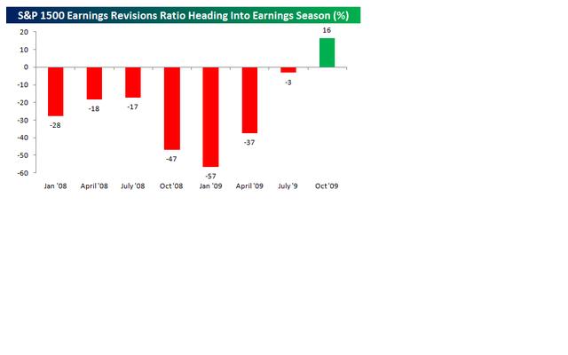This brings us today, and the start of Q3 earnings season. As shown below, analysts are more bullish heading into the current earnings season than they have been at the start of any other earnings season since the recession began. Over the last four weeks, analysts have raised forecasts for 638 companies in the S&P 500 and lowered forecasts for 391. This works out to a net of 247, or 16.45% of the index. While some would argue that bullish analysts are a contrarian signal, we would note that earnings revisions were negative for several quarters and turned much more negative before they became a contrarian signal. With that said, the positive earnings revision ratio does set the bar higher than in prior quarters. Beginning today, we'll find out of the bar is too high.