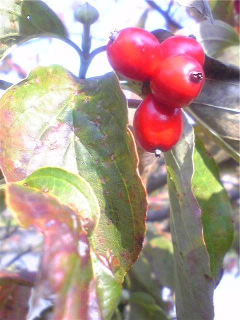 秋、はな、柿 ハナミズキ アメリカヤマボウシ キンモクセイ:キンモクセイの香りが漂う季節です。ハナミズキの実が赤くなってきました。遠くに柿を取る人が見えます。秋を感じる光景です。