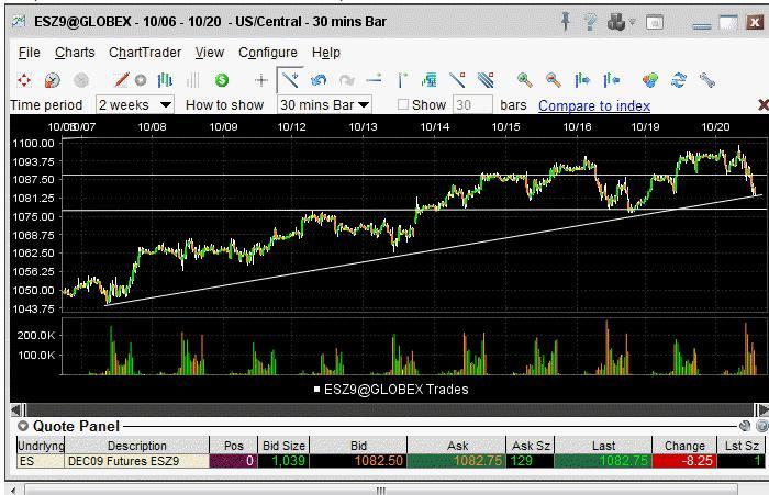 With the equity market's negative reaction to positive earnings reports overnight and this morning, the S&P 500 is currently testing the uptrend that it has been in since the beginning of earnings season when Alcoa (AA) reported. Currently, the uptrend stands at 1,090, so as the index drifts down near that level, traders can expect at least an attempt to bounce at support.