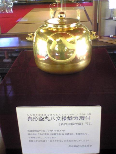 金、茶釜、名古屋城 :金の茶釜で沸かしたお湯で一杯。本物はお城に飾ってあるが、これも相当する代物です。