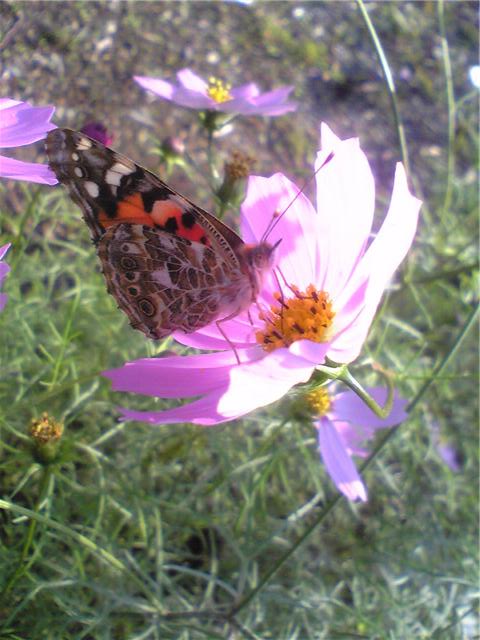 はな、コスモス、ちょう:コスモスもいろんな種類があるようです。蝶も飛んできて蜜を吸っています。