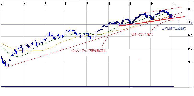 ①3月からのトレンドラインを割り込む