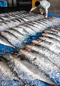 荷さばき所には体長約八五~九〇センチ、重さ一〇キロ前後の大型ブリが次々と並べられた。一キロ当たり二千円程度で競り落とされ、県内外に出荷された。