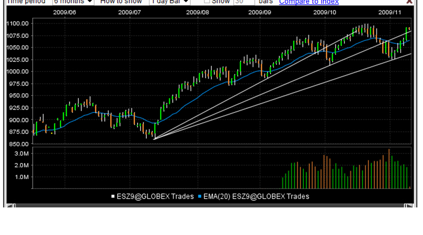 As we rise towards another high in the indexes (DJIA already hit one), I'm struck by the creation of these fan lines clearly visible on the SPX. Usually fan lines (according to Edwards and Magee) are one of many possible reversal signs on an Intermediate term timeframe. The thought is, on the break of the third fan line, then you have confirmation of the correction unfolding. Here's the chart.