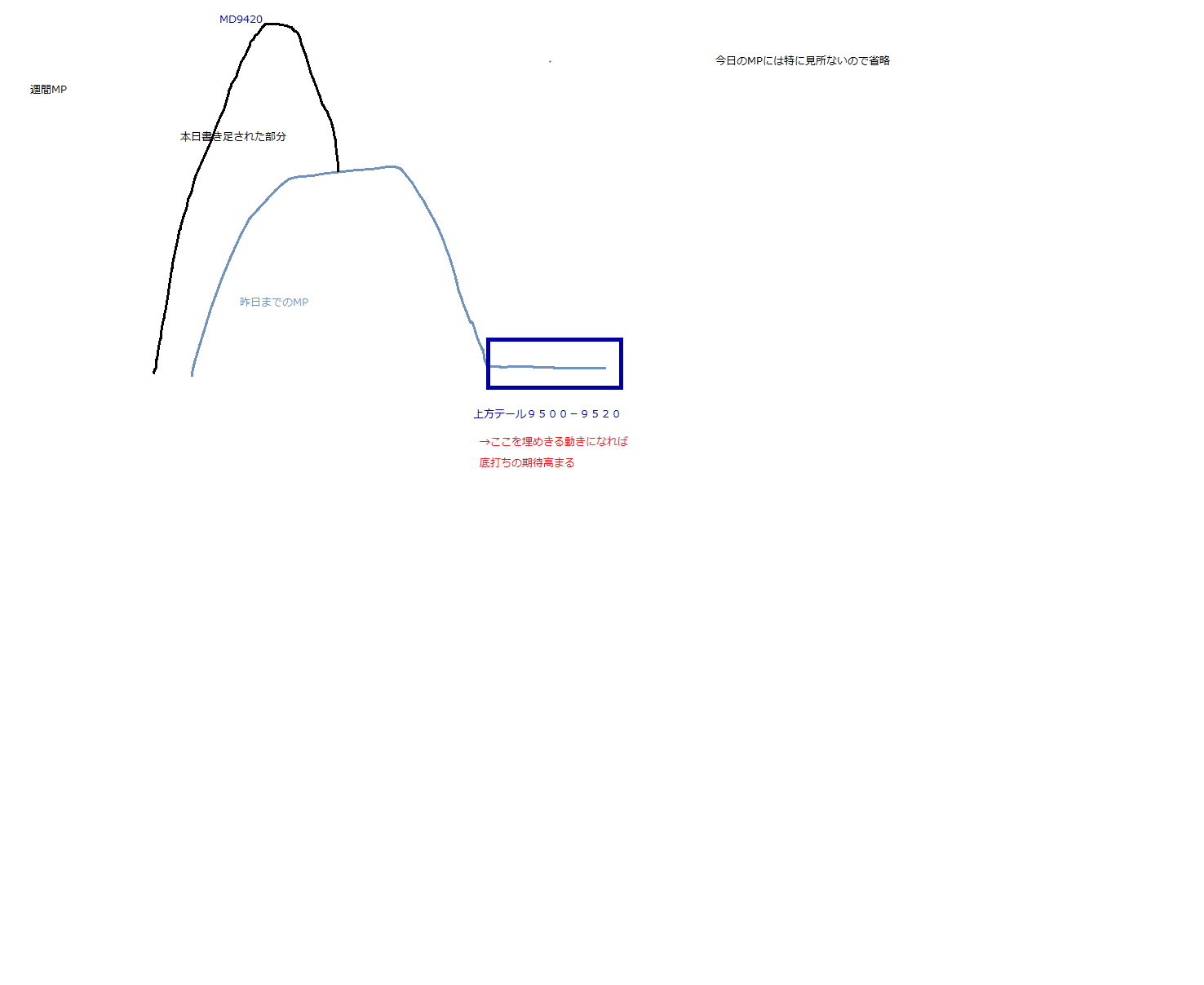 これらをクリアして先週の上方テール9860-9870を埋める動きになれば底打ち完了といえるのではないか。