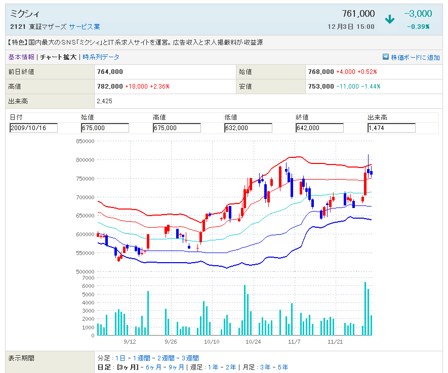 ううっ、・・ミクシィは下値を買われてまして、大きく下げないので、ここで買うと良いかもしれませんよー、今日か月曜に上を目指して上がって欲しいのですが、2008年9月に921000円の壁がありますので、それに挑戦する動きか、今日あたりもうちょっと下げるのか、微妙ですね。1株買って、下ればもう1株買いをされたらいかがですかぁ?