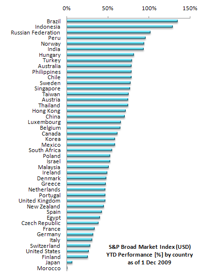 ところがこのような「友愛」政策にもかかわらず日本株がまったくさえない。図1は米国S&P社が算出している国別の株式市場のパフォーマンスである。各国通貨の変動をとりのぞくためにすべてドル建てで計算してある。年初来の日本株のパフォーマンスはS&Pが算出する45か国中44位である。ブラジル、ロシア、インド、中国などの新興国は軒並み株価が2倍前後になっており去年の経済危機からV字回復している。米国、欧州の先進国も最悪だった2008年から株価は順調に回復しているようだ。しかし、日本株のパフォーマンスはわずか7%であり、かろうじてモロッコに勝っているだけである。年初来で円高ドル安がかなり進行したので、自国通貨の円でみると日本の株価はなんと年初来でマイナスなのである。世界の株式市場の中でまさに日本のひとり負けなのだ。