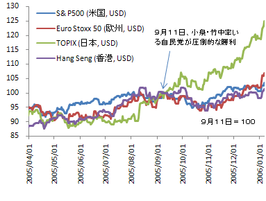 図3をみていただきたい。これは小泉純一郎と竹中平蔵率いる自民党が郵政選挙とよばれた2005年の衆院選で圧勝したときの株価の推移である。衆院選の9月11日が基準になるようにやはりドル建てで世界の株価との比較をしている。