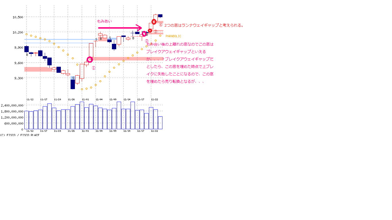 もし、①②がブレイクアウェイギャップ(トレンド転換のはじめに現れる窓で、この窓をうめるということはトレンド否定となる)だとすると、①②の窓をうめない限りは現在のトレンドは継続と考える、、、でも、①②がランナウェイギャップだとすると、単なる抵抗と考えられるので窓をうめたとしてもそれほど重要性はない(トレンド転換と考えるほどの重要性はない)のかと、、、