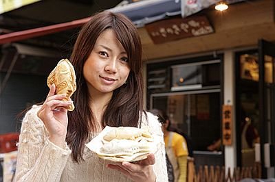 「まぐろやき」を持っている写真は築地の寿司店で働いているアイドルの芹沢那菜さん。