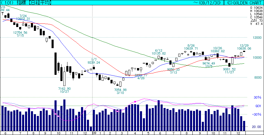 ただ、週足(中央・青色チャート)を見ると、年末ラリーのおかげで最も恐れた週足デッドクロスを免れた形になっており、仮に調整となった場合も日足、週足ともに抵抗線がある¥10,000付近までで下げ止まる可能性が高いのではないかと見ておりまする。