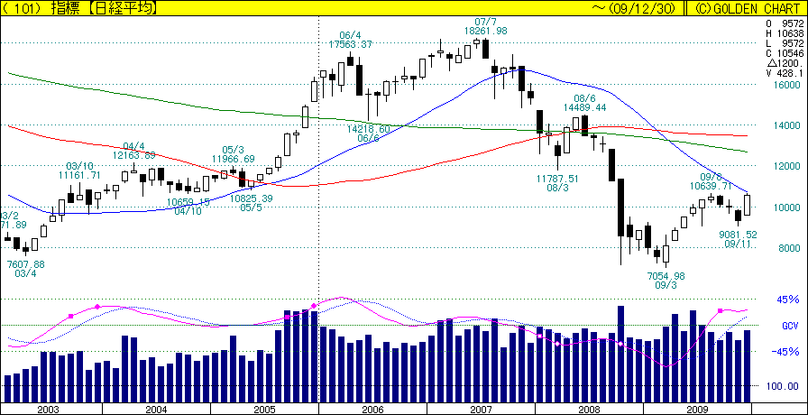 最後に月足(右側・黄色チャート)を見てみるとおわかりの通り、昨年3月を大底として相場は順調に戻してきたところと申せましょう。状況としては2003年に似ているかと存じまする。
