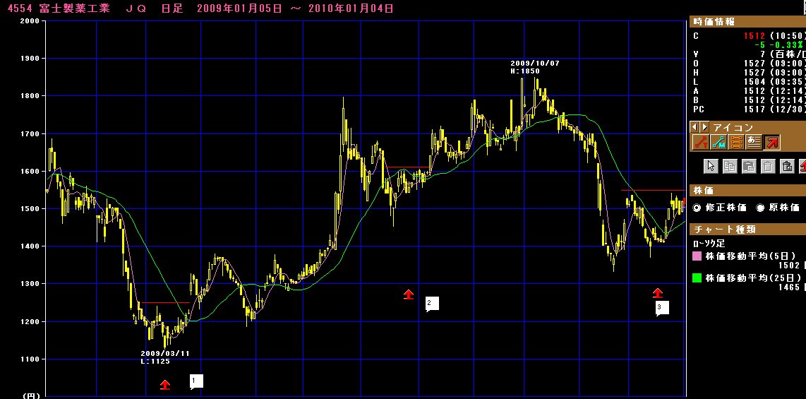 写真の1,2,3の印の部分を良く見ましょう。急落の後は、実は、中期ねらいなら、赤い線の間は、どこでも「買い」なのですよー