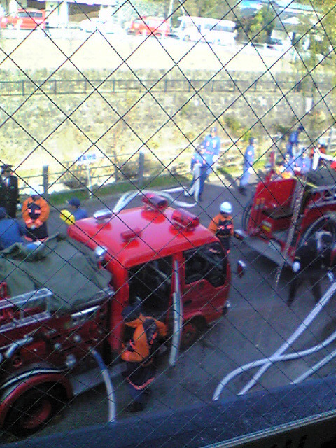 パレードが終わると今度はすべてのポンプ車による川への放水が始まります。建物から出てすぐ近くに地元の消防団がいたので後輩と話をしながら一斉放水を眺めました。