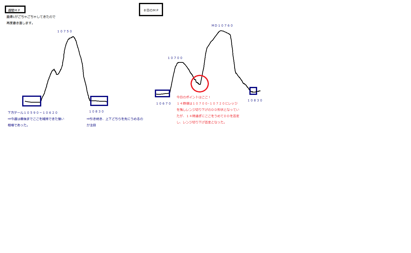 今日のポイントは14時頃の10700-10720での動き!日中MPはDDでレンジ切り下げとなっていたのが、ここを埋めたことによってDD否定でレンジ切り下げに失敗した(売り方の負けが決まった)のでその後のショートカバーにつながった
