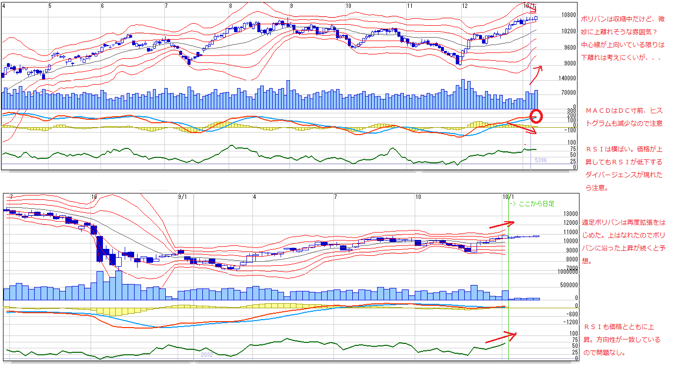 ・日足、週足とも半年ぶりにGCしているので、いきなり下げるとは考えにくい。過去のGCをみると、3ヶ月~半年程度はGC状態が続くので、そのくらいの期間は上昇をつづけると予想。