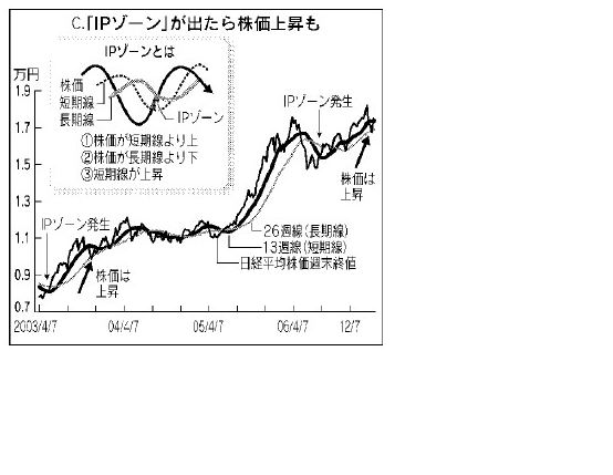 グラフCは十三週と二十六週の二つで判断したものだが、実際に二〇〇三年以降で明確なIPゾーンが表れた後、株価は上昇している。「より長期の平均線で見れば確率はいっそう高くなる」(川口氏)という。ただIPゾーンも当然絶対ではなく、他の指標と組み合わせた判断が必要だ。