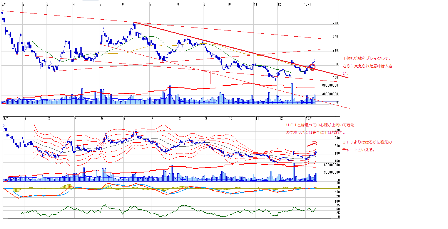 ・UFJは中心線が横ばいだがみずほは中心線が上むいてきたのでボリバンも完全に上離れたといえる。