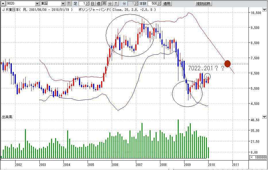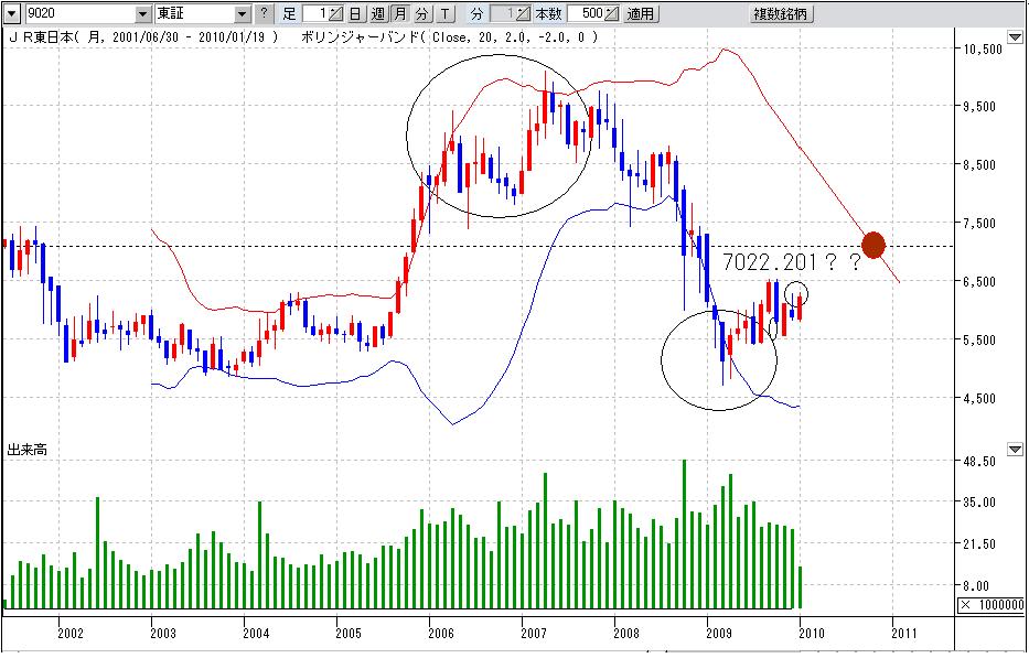 中心線(日足ならたいてい25日線、週足なら13週線)の向きが大事で、中心線が横ばいから上むいてきたらボリバンも上に押し上げられる可能性が高く、下向いてきたらおしさげられる可能性が高い、、、