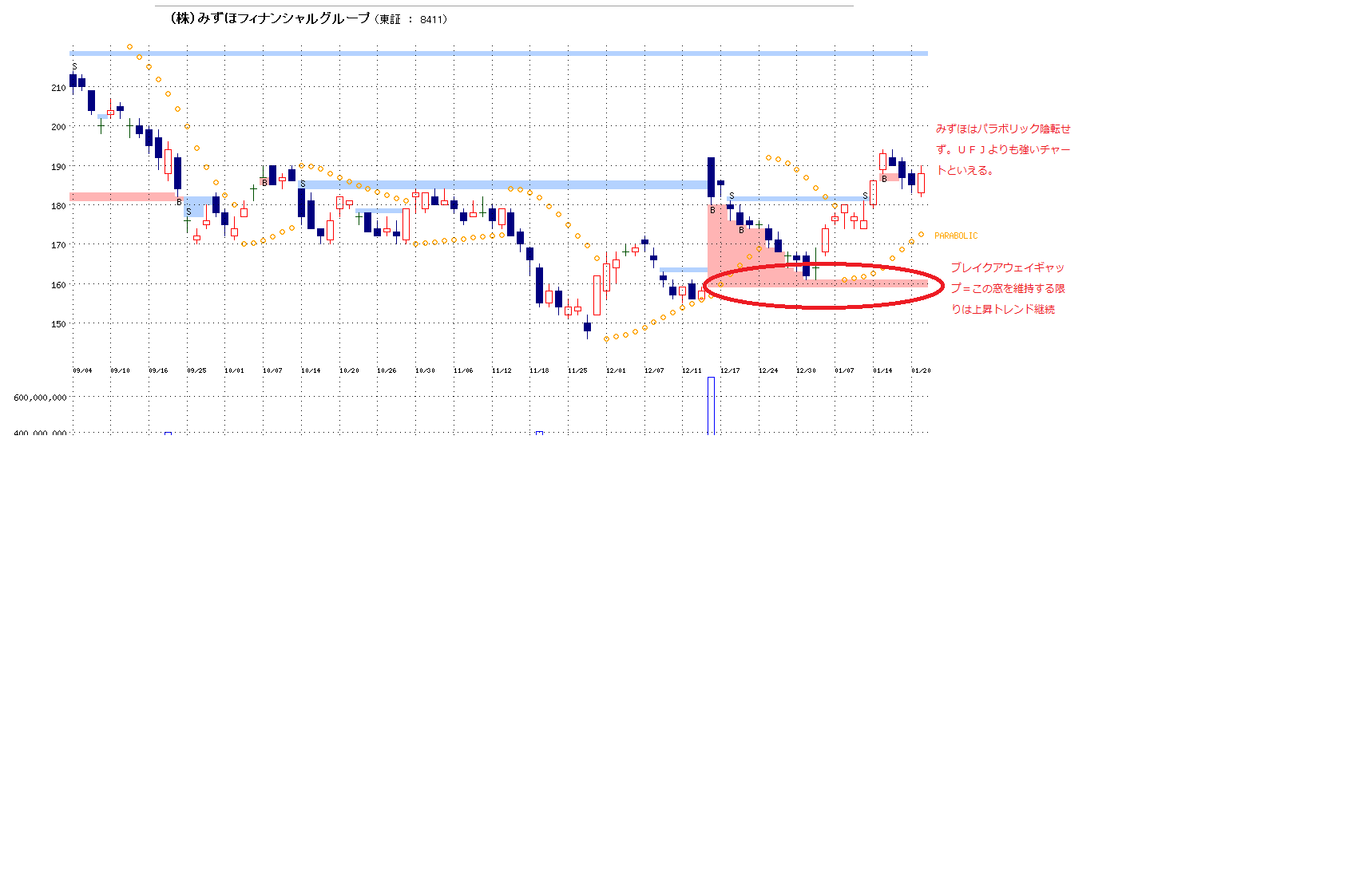 みずほはチャートがよくなってきて「おし!買いサイン!」と思ったところに悪材料がでて突き落とされるパターンが多かったので、今回もそうかと思ってたらがんばりました^^;予想外の強さでしたので予想してませんでした(笑)