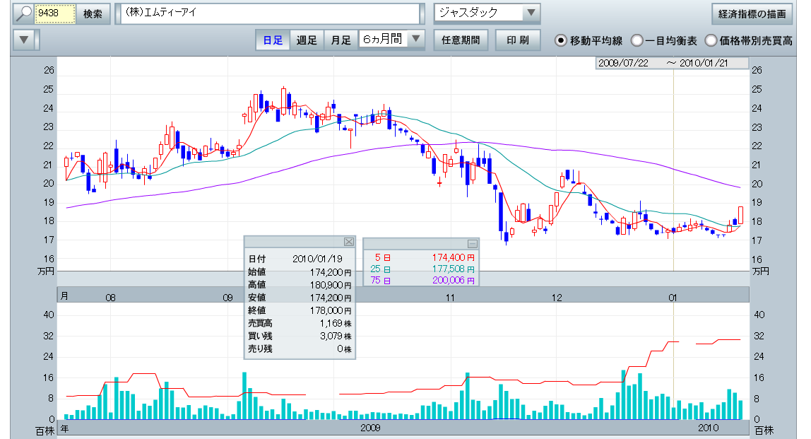 19日の日記で、9438 :エムティーアイが買いサインとなりました・・・と書きましたが昨日は10000高いストップ高となり、買った方は大喜びでしょう