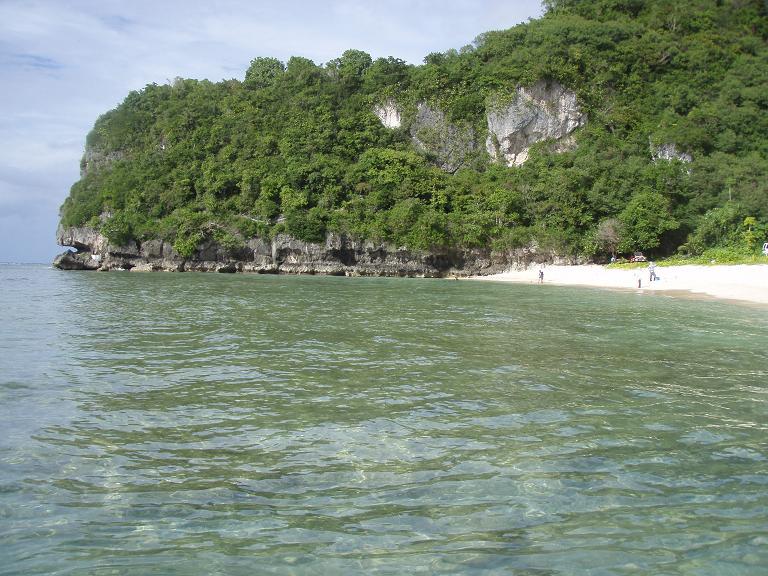ビーチからのエントリーでまずは沖に向かい歩いていく、湾の先端の丘の先に恋人岬が見えてきた。