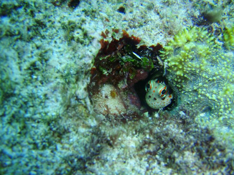 戻りがけに穴の中から顔を出している、モンツキカエルウオを見つけて、カメラを近づけるがなかなか穴から出てきてくれません。