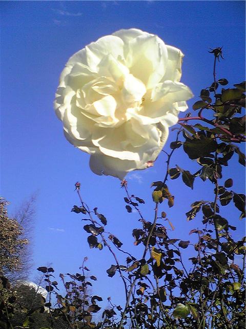バラは小さい写真で見ると、青空に浮かんでいるように見えます。