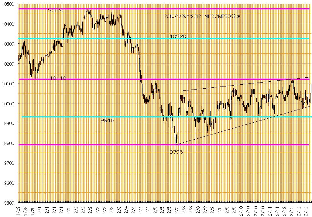 NK先物で大証(ラージでイブ含む)とCME(円建て)の30分足をつなぎ合わせて、時系列で表してみました。CMEの1/29~2/12までのロウソク足なんですが、エクセルでデータを作ると350行くらいになって、グラフにしたら、ほとんど折れ線状態です。(泣)