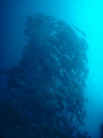 潜行してドロップオフに入ると、いきなりギンガメアジの大きな群れが現れた。