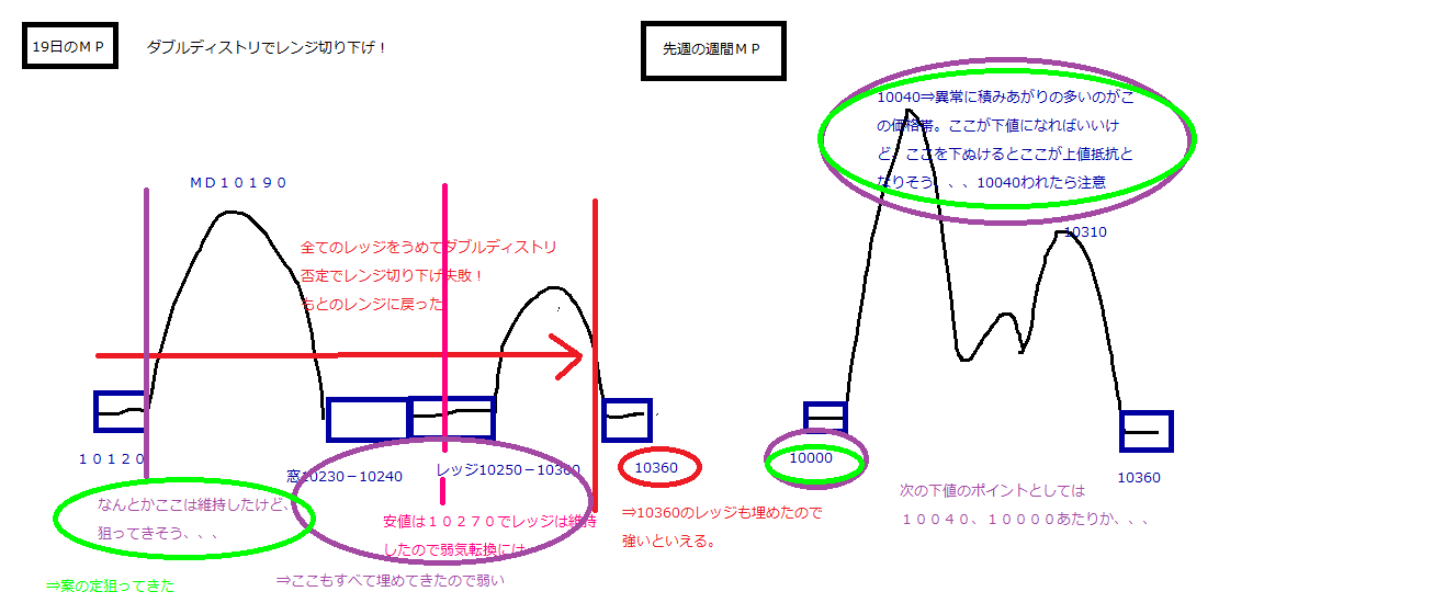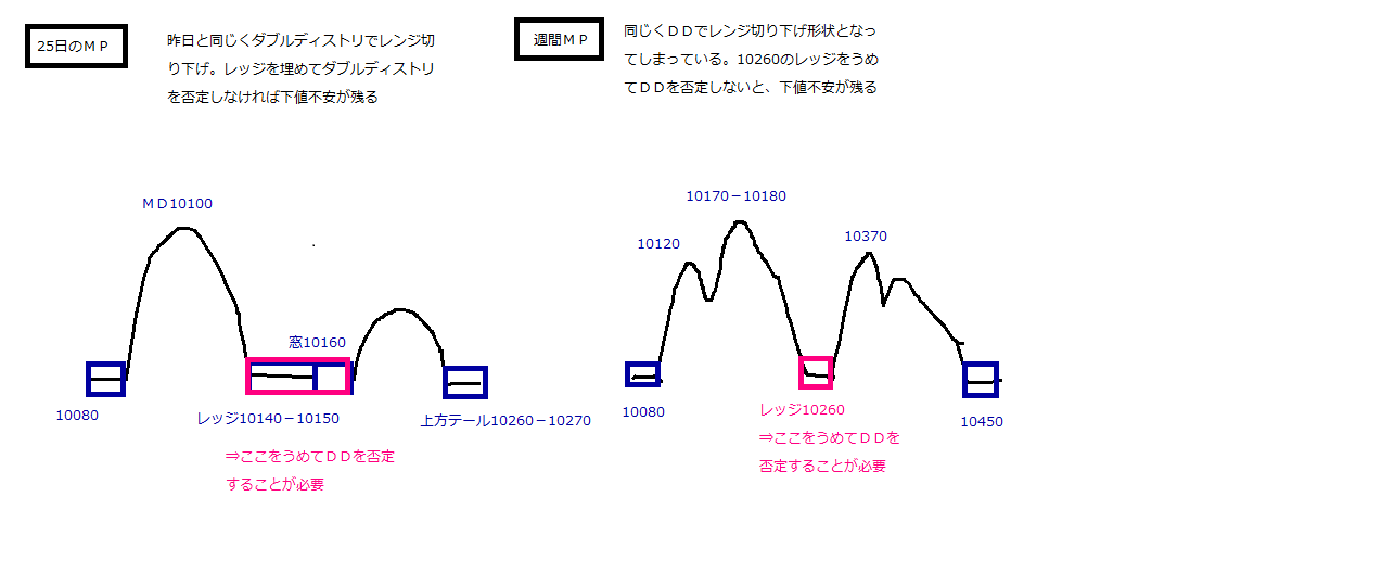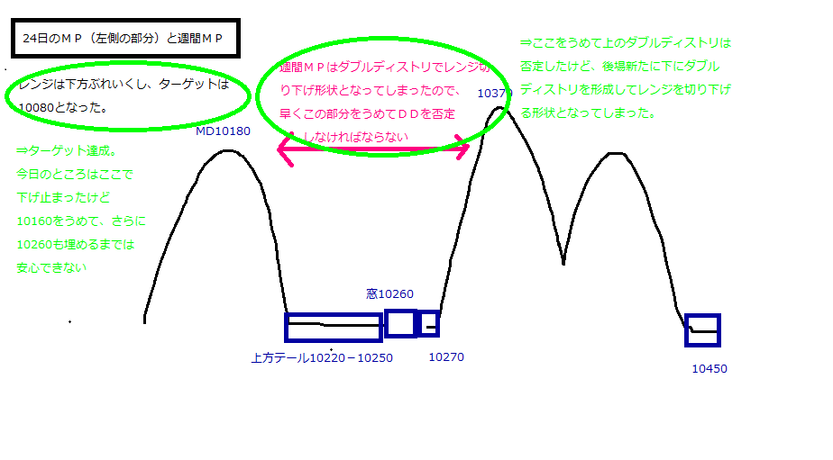 ・まずは今日のレッジ10140-10150を埋めてDDを否定することが先決、その上で週間MPのレッジ10260を埋めてDDを否定して初めて下値不安が消える。