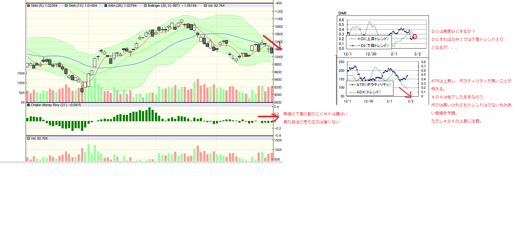CMFをみてもDMIをみても、ボラティリティ(上下の値幅)は大きいけど、一方向へのトレンドが出るというよりは、もみ合い相場となるように思える。