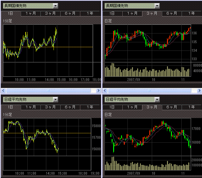 ・10年債利回りは、量的緩和以前の水準まで低下しているので、JGB先物をそこまで買うかー?とは思いますね。日経平均先物は無理やり売り叩いている感じもします。基本はサブプライムローン問題による不安とファンドの期末売りが大きいのでしょうけど、意図的な売り仕掛けもかなりあるのではないかと。雰囲気は去年の11月に似ていると思いました。