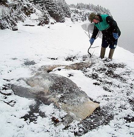 サメなどの死骸が腐敗して骨格が抜け落ちて肉部分だけが漂着するとよくこういうのと間違えられるのですが、ただ写真を見る限りは明らかに「シッポ」があるんでサメとかクジラって可能性は無さそうですよネ