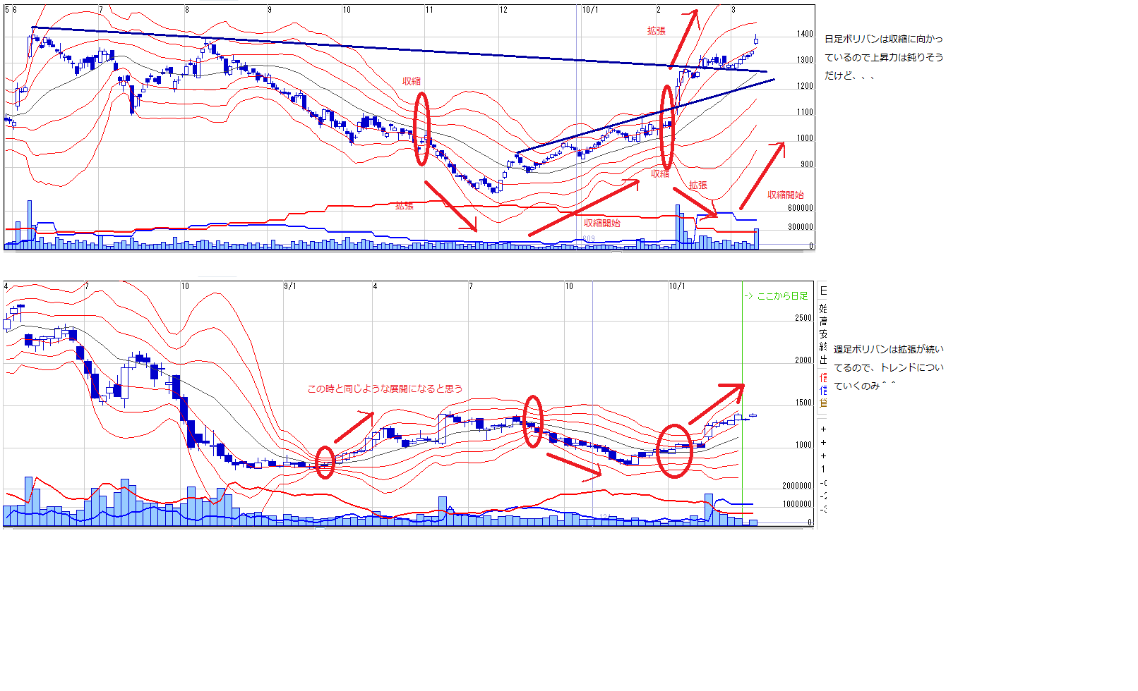 ・週足はボリバンの拡張が続き、ボリバンにそった上昇が続くので中期強気