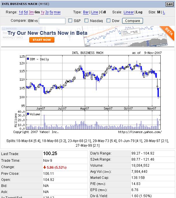 ・先週末のNY市場は大幅続落。米大手銀ワコビアの追加損失の計上、消費関連の経済指標が弱かったこと、輸入物価指数が予想よりも上昇したことによるインフレ懸念(ドル安の影響が出てきた?)などを嫌気したようです。特に、IBM、google、amazonなどのこれまで強かったハイテク株が利食い売りで大きく下げました。リスク回避の手仕舞い売りでしょうね。金融株は上がっているのが多かったです。ワコビアも上がってました。