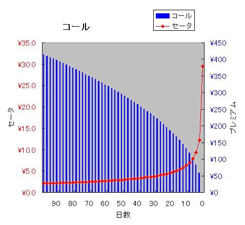 <<図1>>は、コールのプレミアム(青の棒グラフと右軸)とセータ(赤の折れ線グラフと左軸)を「残存日数」の関数として表したものである。
