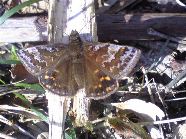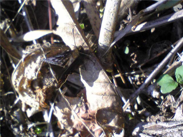 ちょう ミヤマセセリ かいしょの森:ミヤマセセリ、チョウ目 セセリチョウ科 チャマダラセセリ亜科 食草は、クヌギ、コナラ、カシワ。早春の蝶です。落ち葉にまぎれて全くわかりません。擬態しているのでしょう。このほかクロコノマチョウなどもいました。2010.4.8かいしょの森にて。