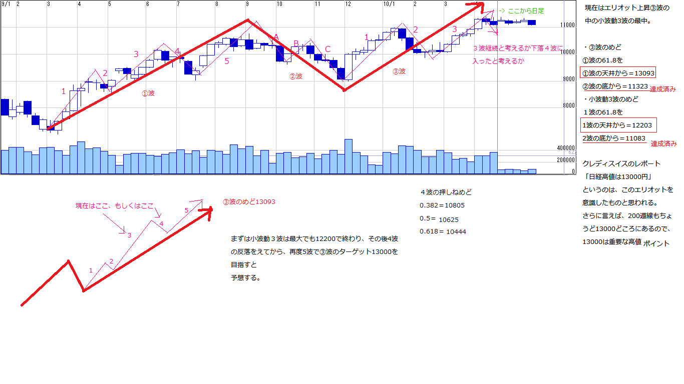 まずは小波動3波の上値めど(最大で12200)達成後に小波動4波の下げ(押し目)をはさんだ後に、小波動5波の上昇で第③波の上値めど13093を目指す。