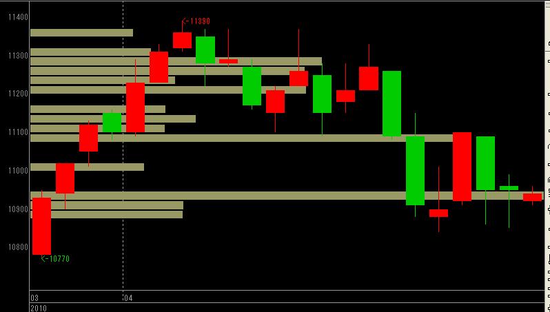 過去1ヶ月のものと2ヶ月のものを見てみると、現在の10920に大きなカベがあります。また、下では、10640あたり、上では10040あたりでしょうか?
